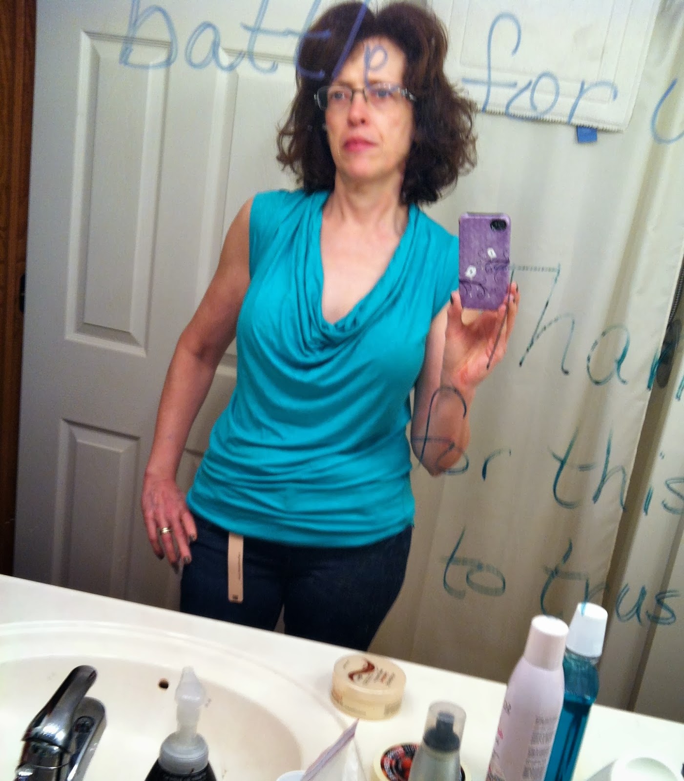Hmmm. Not a good start. The color was fine, but it was shorter than I like, and flared at the bottom. Jerry said it looked like a maternity top (or what we used to wear as a maternity top). Don't want to go there. Wasn't crazy about the stripes, either (and please excuse the bad selfie pictures. Not good at them, nor do I have a full-length mirror). Uh, no on this top.